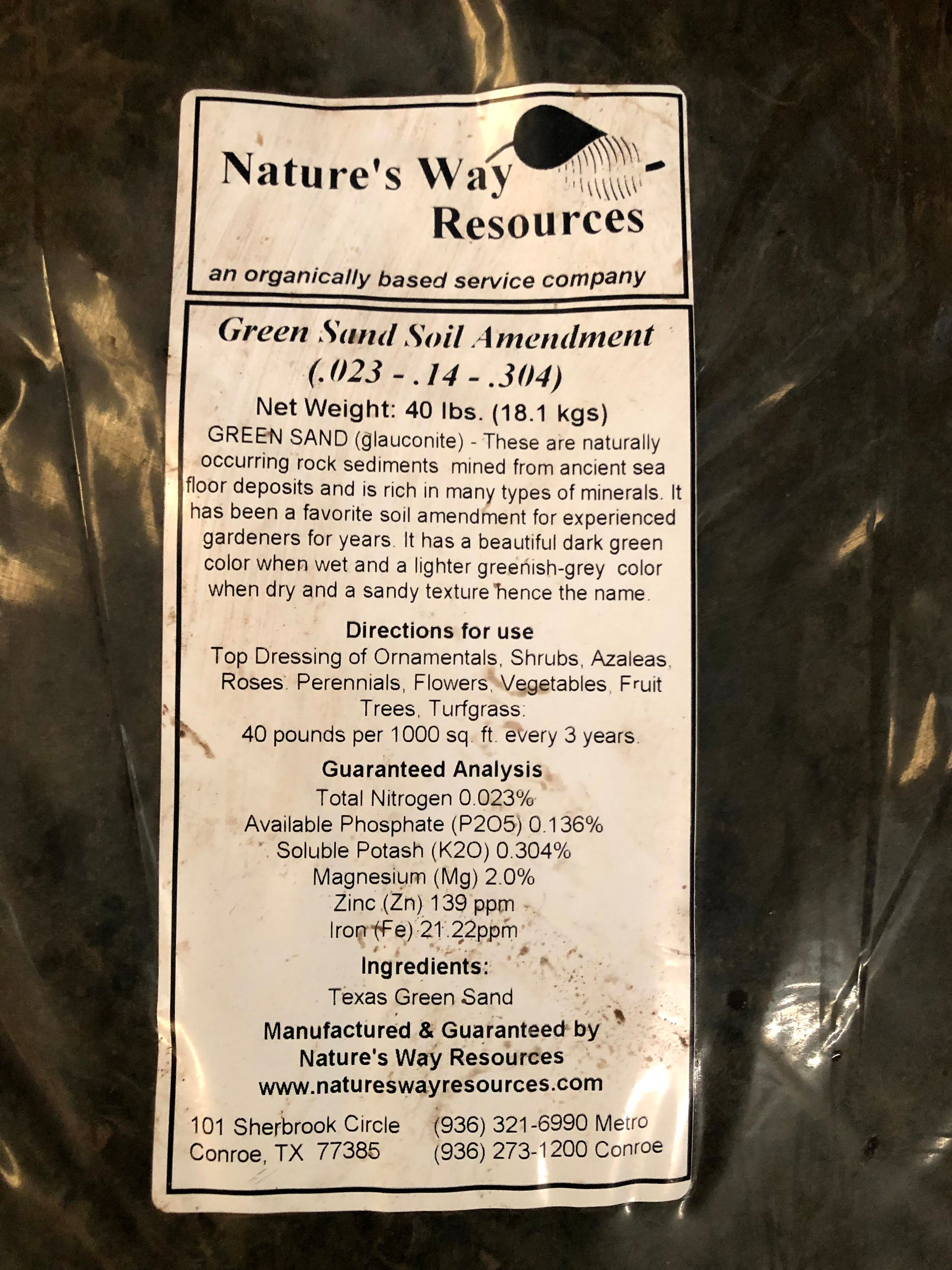 Embrace the power of local, sustainable gardening with Nature's Way Resources' Green Sand, a superior soil amendment mined from the ancient sea floor deposits along the Texas Gulf Coast. Celebrated by experienced gardeners, this naturally occurring glauconite sand not only boasts a rich, dark greenish-grey color that beautifies your garden when dry but also enhances soil structure with its beneficial sandy texture. Perfect for improving water retention and facilitating slow nutrient release, Green Sand is the eco-friendly choice for enriching your soil naturally.